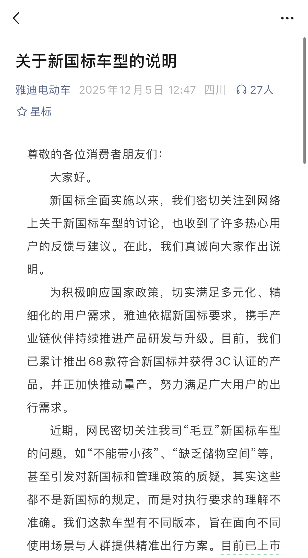 雅迪表示,为积极响应国家政策,切实满足多元化、精细化的用户需求,雅迪依据新国标要求,携手产业链伙伴持续推进产品研发与升级。目前,我们已累计推出68款符合新国标并获得3C认证的产品,并正加快推动量产,努力满足广大用户的出行需求。