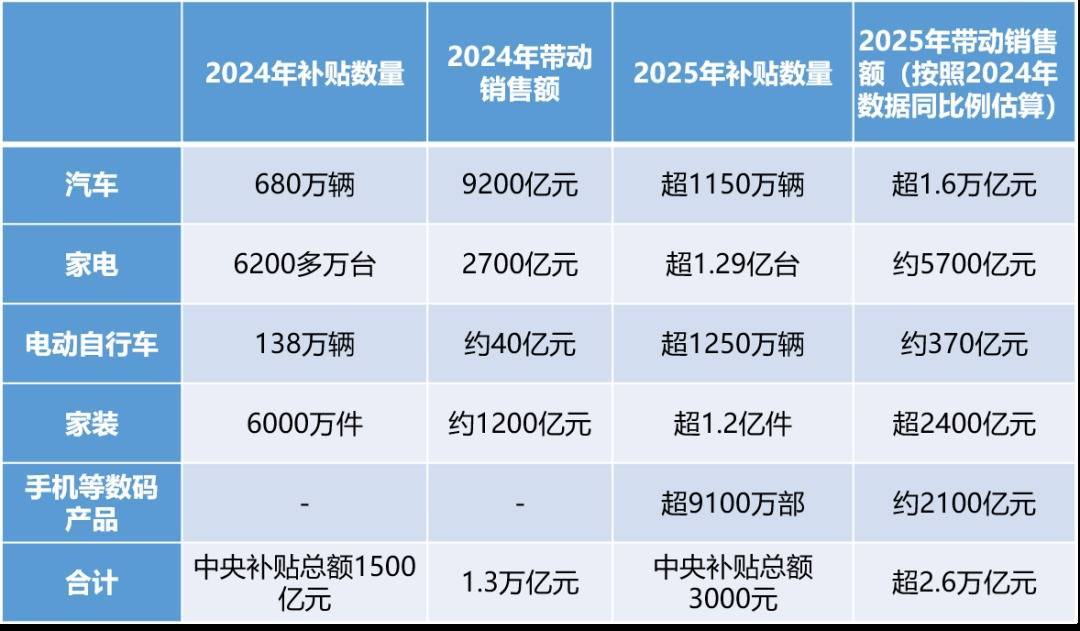 2024年7月国务院印发《关于加力支持大规模设备更新和消费品以旧换新的若干措施的通知》,明确向地方安排1500亿元左右超长期特别国债资金,用于支持消费品以旧换新。2025年则安排3000亿元超长期特别国债资金支持消费品以旧换新加力扩围,享受以旧换新补贴的家电产品从8类增加到12类,实施手机等数码产品购新补贴。