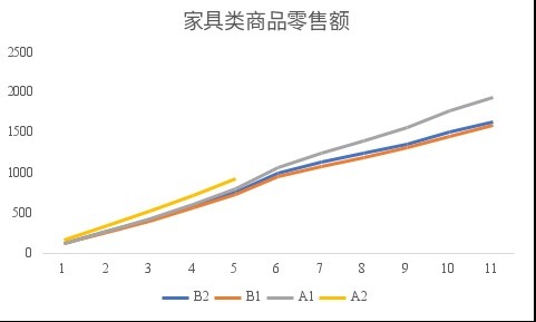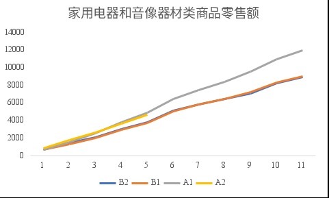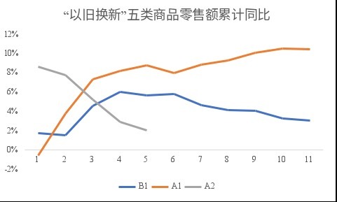 可以看到,“以旧换新”政策实施后的第一个完整年份(下图中A1)相关品类商品销售额增长10%,明显快于政策实施前(年度仅增长约3%,下图中B1);但政策实施后的第二个不完整年份(下图中A2)仅比政策实施后的第一年同期增长约2%,明显慢于政策实施后第一年同期比政策实施前约9%的增长。