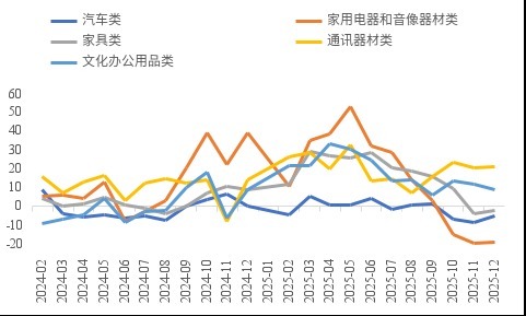 从“以旧换新”相关的五大类商品零售额看,同比增速总体呈现“先加快——后回落”的态势。2025年,限额以上单位中,通讯器材类、文化办公用品类商品零售额分别比上年增长20.9%、17.3%,全年四个季度均保持两位数增长;而家用电器和音响器材类、家具类商品零售额全年虽同比增长11%、14.6%,但当月增速均已转负;汽车消费增长已慢于整体商品消费。