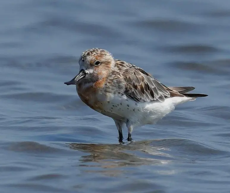 勺嘴鹬的羽色会随季节巧妙变化,繁殖期时,身披黑褐色羽毛,带有红栗色羽缘,头、颈及胸部呈现红棕色并带有暗褐色纵纹。