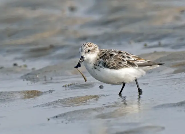 这种小型水鸟背上披着淡褐灰色的羽毛,肚子周围则是雪白的羽毛,而腿部则是黑色的。