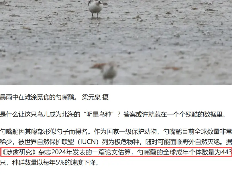目前全球成年勺嘴鹬的数量不过443只,这个数字甚至少于中国大熊猫的野生种群数量。