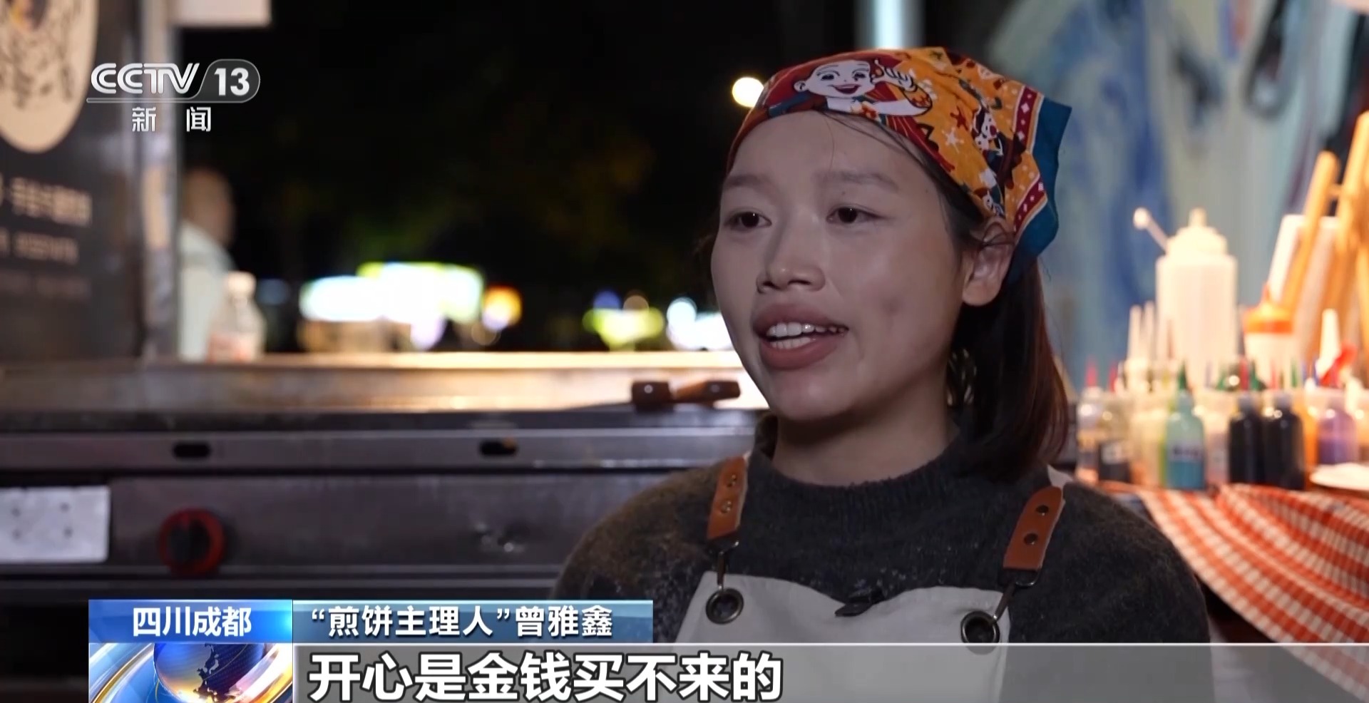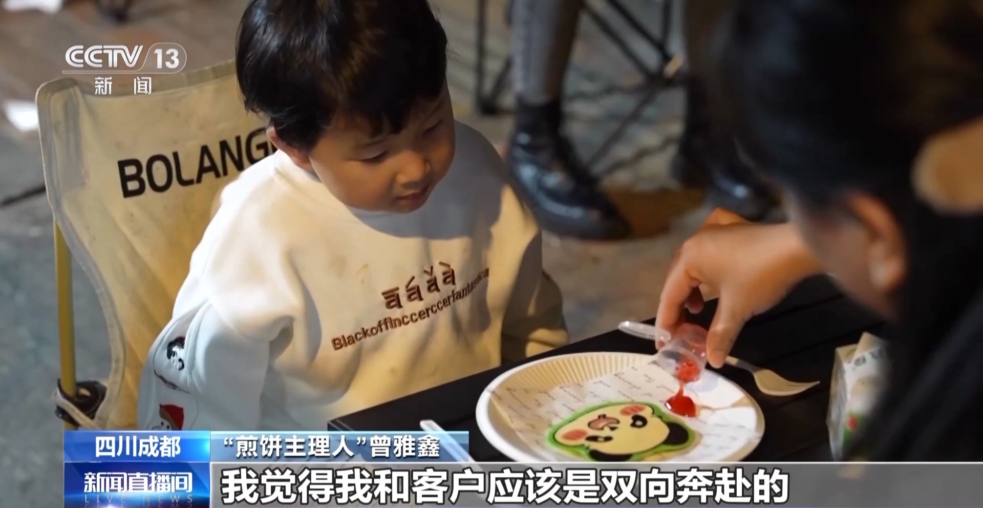 曾雅鑫告诉记者,自己是学美术专业的。偶然的机会看到成都夜市人气火爆,也想着来这里做点生意。几经思考,她决定结合自己的专业特长,开辟卡通图案煎饼这条“新赛道”,赋予传统小吃全新的形态和艺术价值。没想到,这样的创意赢得了不少消费者的喜爱。随着曾雅鑫制作卡通煎饼的短视频在网络上走红,更是有全国各地的游客慕名而来,她也被网友们称为“煎饼主理人”。