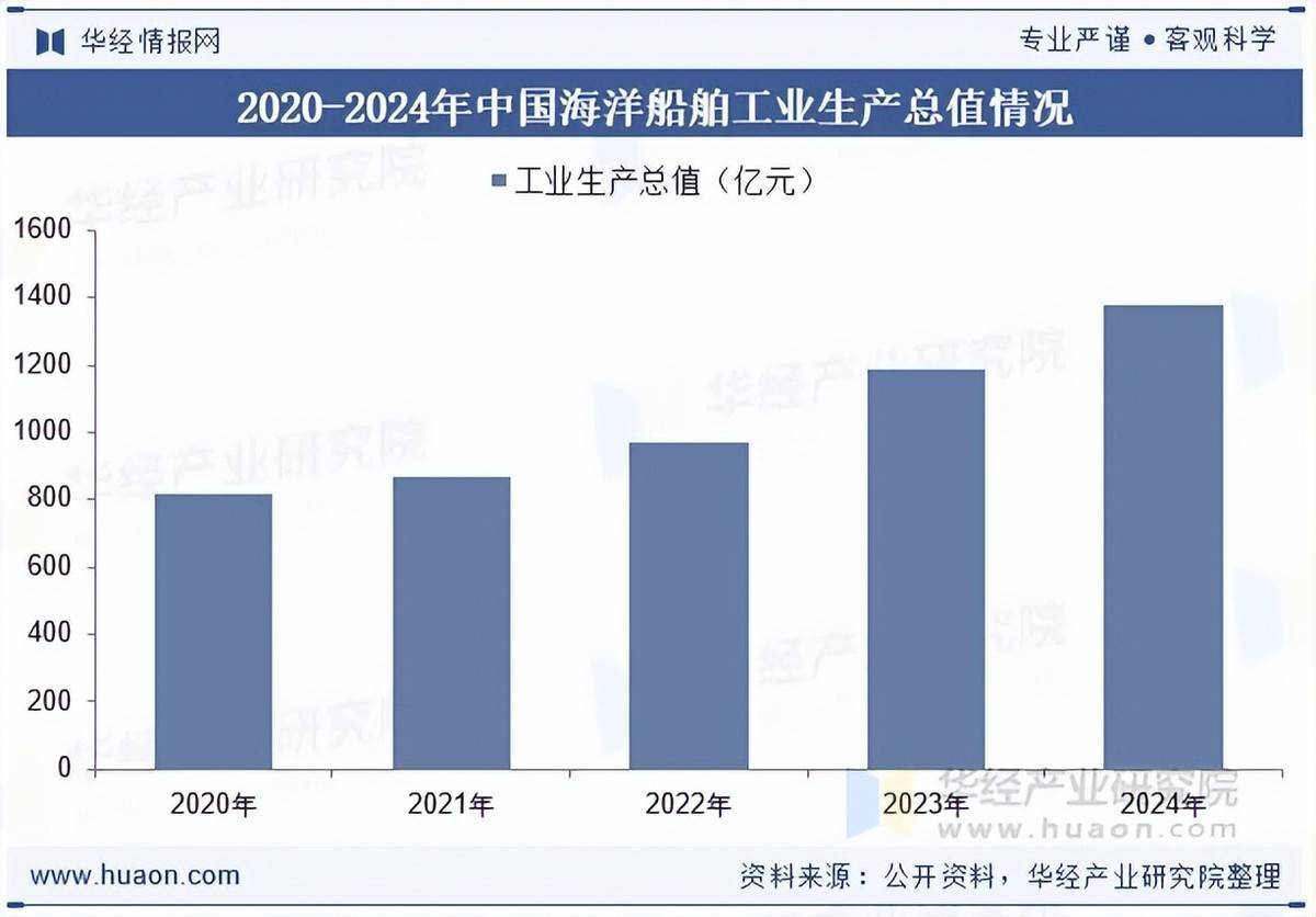 中国海洋船舶工业总产值在2020年至2024年间呈现持续增长态势,从2020年的819亿元逐步上升至2024年的1370亿元。期间年增长率波动明显,2021年同比增长6%,2022年提升至11%,2023年达到22%的高点,显示出行业强劲复苏和扩张趋势。尽管2024年增速有所放缓至16%,但整体产值仍保持较高水平,反映出中国海洋船舶工业在市场需求和技术升级推动下的稳定发展。该趋势表明行业正受益于全球航运需求回升、绿色船舶技术推广以及国家政策支持等多重因素。